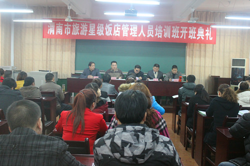 2013年11月25日上午,市委人才工作领导小组办公室、市文物旅游局在beat365朝阳校区beat365正版唯一官网学术报告厅隆重举行“渭南市旅游星级饭店管理人员培训班”开班典礼。出席开班典礼的有渭南市委人才办副主任刘有辉、渭南市文物旅游局局长李东平、beat365正版唯一官网院长助理王录军等有关部门领导同志。