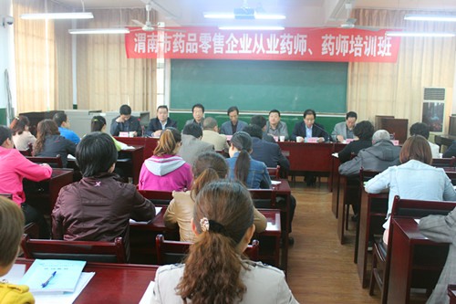 2014年4月24日上午,由渭南市医药商会主办、beat365正版唯一官网承办的渭南市药品零售企业从业药师、药师培训班在学院朝阳校区开班,各县(市、区)药品零售企业从业药师、药师及部分药品零售企业其他岗位人员共100多人参加为期2天的专业培训。开班仪式上,学院院长助理王录军致欢迎词,市医药商会会长王江宽、市工商联副主席李林、市食品药品监督管理委员会副主任王耀峰出席并做重要讲话。