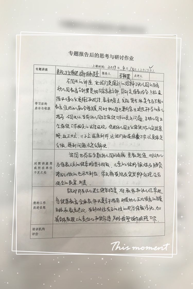 高洁:紧张而又充实的学习今天已经进入最后的倒计时了,但是老师们一场场的讲座却时常回荡在我的脑海里。从幼儿园的安全管理到幼儿园的档案管理,从幼儿园的科学保教到如何开展家长工作,从用法律法规依法办园到幼儿园教育与小学教育的区别,怎样做好幼小衔接等等,通过这几天的学习,使我意识到自己各方面的不足,更感觉到做为幼儿园园长以及老师们的指导者而任重而道远,也切实认识到自己的责任重大。通过这次的学习,我觉得不仅要加强园内教职工要明确自己的职责,更要求老师们不断加强自学,严格要求老师们提高自身的素质和工作能力。幼儿园教育只有想不到的,没有做不到的,我相信,只要我园老师们用去心呵护去浇灌我们的孩子,热爱幼儿园的工作,孩子们一定会在阳光三宝双喜幼儿园健康快乐的成长,每个孩子都会开出一朵魅力无比的花朵。