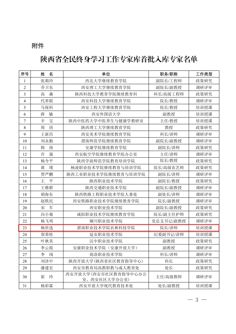 根据《陕西省教育厅办公室关于公布陕西省全民终身学习工作专家库首批入库专家名单的通知》(陕教职办〔2022〕21 号),beat365农林科技学院院长杨世选成功入选全民终身学习工作专家库首批入库专家。