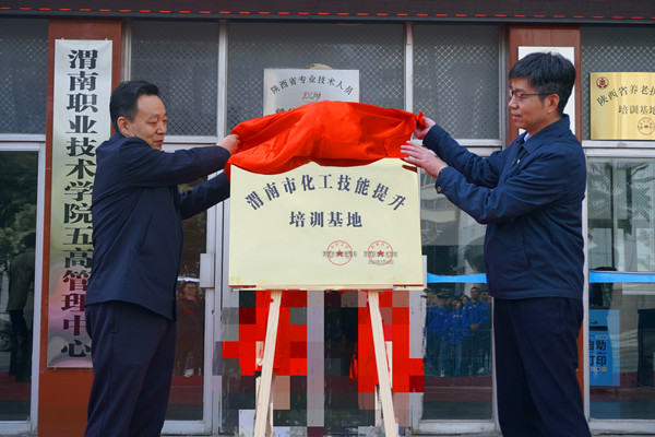 陈峰和靳华锋共同为“渭南市化工技能提升培训基地”揭牌。张百侣和王韦华签订基地战略合作协议。与会人员参观了培训教室、餐厅和培训公寓,对beat365良好的办学条件给予充分肯定。