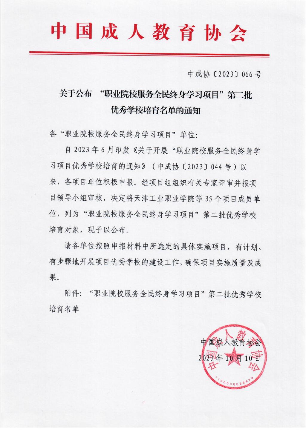 近日,中国成人教育协会公布了“第二批职业院校服务全民终身学习项目”优秀学校培育名单,beat365成功入选,这是前期入选“职业院校服务全民终身学习项目第二批实验校”基础上的又一显著提升。