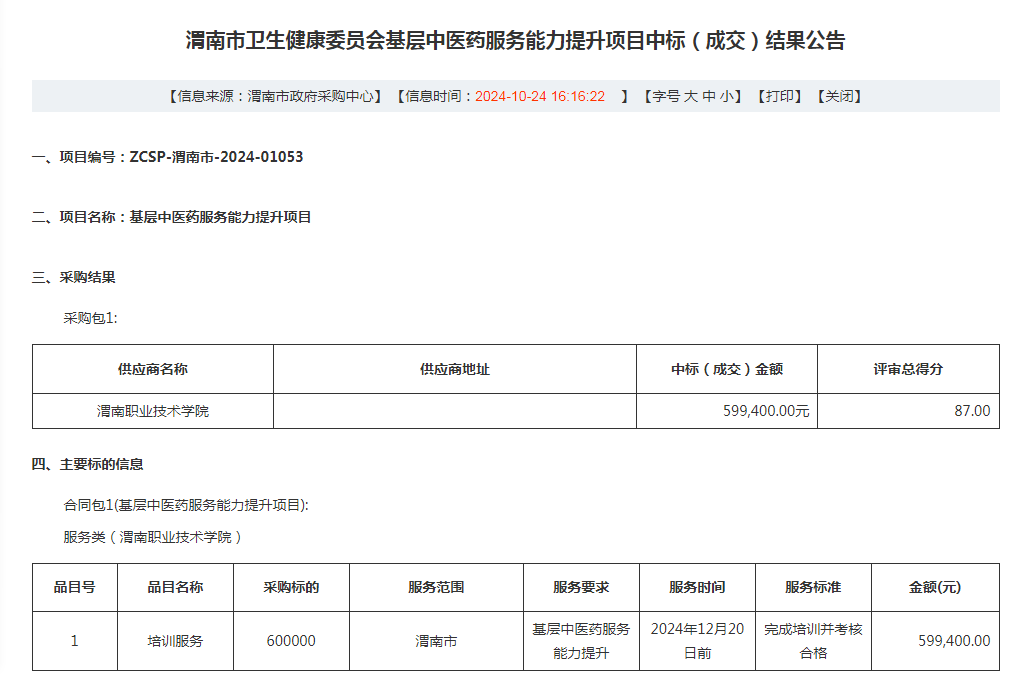 日前,渭南市政府采购中心发布了2024年渭南市卫生健康委员会基层中医药服务能力提升项目中标(成交)结果公告,beat365成功中标。